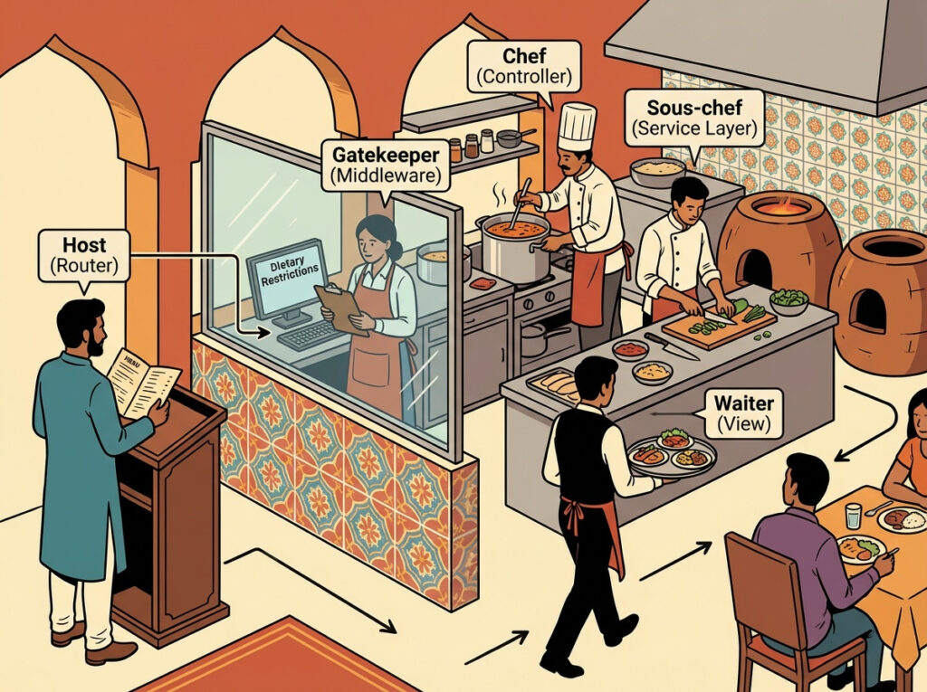 Router = Host directs the customer, greets the customer and determines where to seat them based on their preference like veg or non-veg etc. Also Router directs the request to the appropriate controller (chef). After the host/hostess (Router) has taken the customer’s request, they pass the order along to the kitchen (the Controller), and that’s when the middleware (the gatekeeper) ensures everything is in order before food preparation starts.