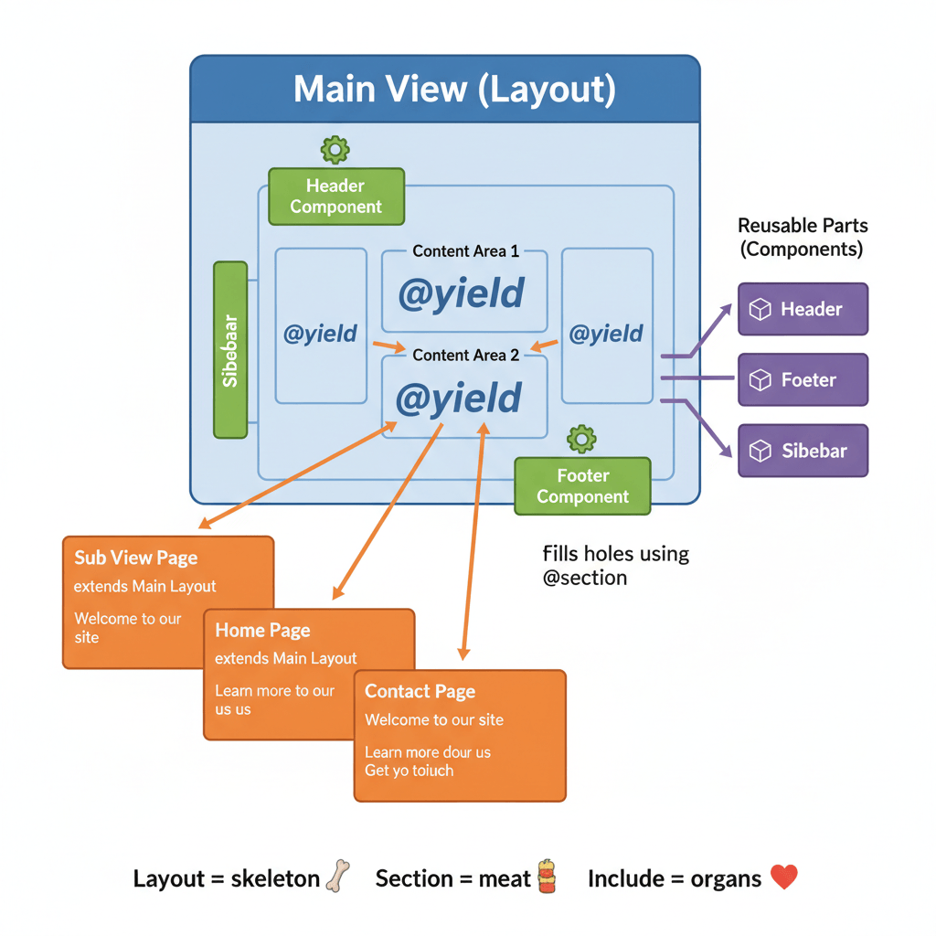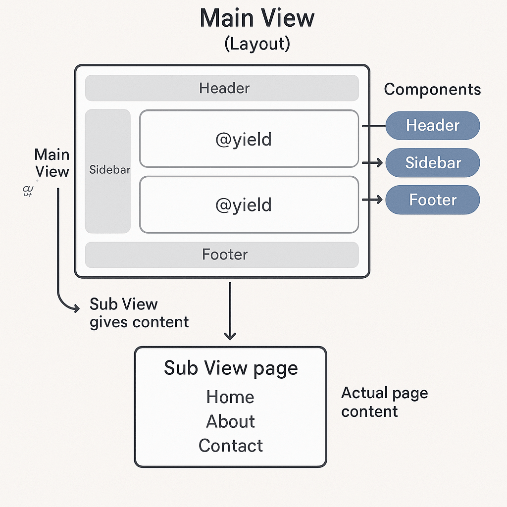 Sub view gives content → Main view provides structure → Components are reusable parts